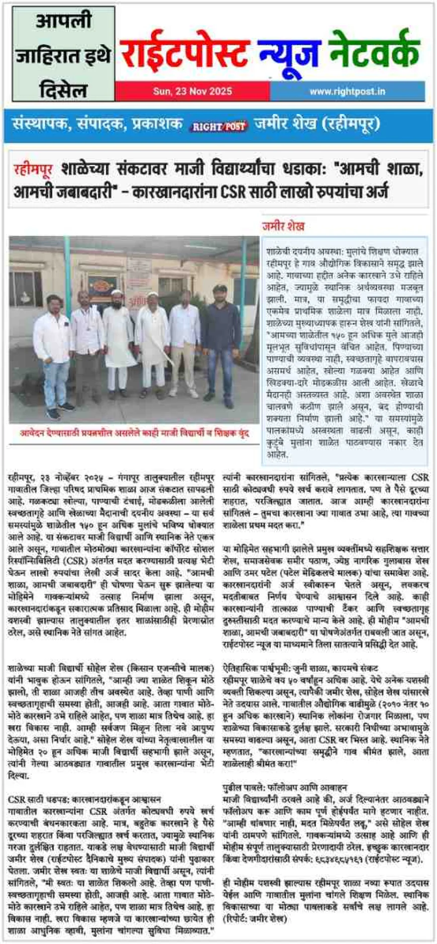 “रहीमपूरने आज दाखवून दिलं की गावकरी, माजी विद्यार्थी आणि स्थानिक उद्योजक एकत्र आले तर शासकीय योजनांशिवायही शाळा बदलता येतात. ही मोहीम यशस्वी झाली तर परिसरातील इतर गावांनाही प्रेरणा मिळेल. राईटपोस्ट या बातमीला सातत्याने प्रसिद्धी देणार आहे, कारण ही फक्त एका शाळेची नाही, संपूर्ण ग्रामीण शिक्षणाची लढाई आहे.”